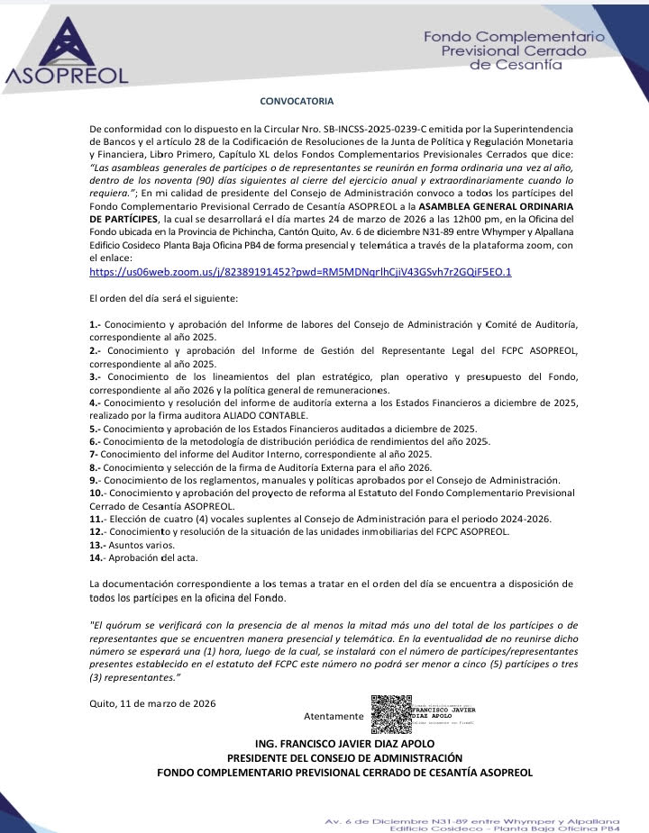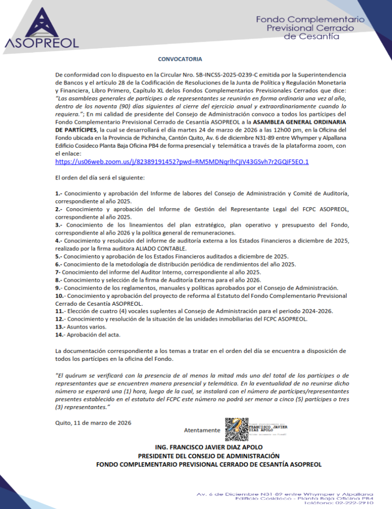 SOBRE NOSOTROS El Fondo Complementario Previsional Cerrado de Cesantía ASOPREOL es una entidad que fomenta una cultura de ahorro en los partícipes. Estos recursos que se administran bajo criterios de transparencia, seguridad, rentabilidad y eficiencia son devueltos al fin de la actividad laboral del partícipe, de manera que disponga de un apoyo financiero. Gracias a las alternativas de inversión disponibles, se ha logrado abrir un portafolio de productos dinámico bajo condiciones ágiles y accesibles que, al mismo tiempo rentabilicen los recursos de los partícipes. A lo largo de la vida institucional, hemos jugado un rol proactivo importante ya que hemos contribuido a cumplir los sueños y metas de nuestros partícipes.